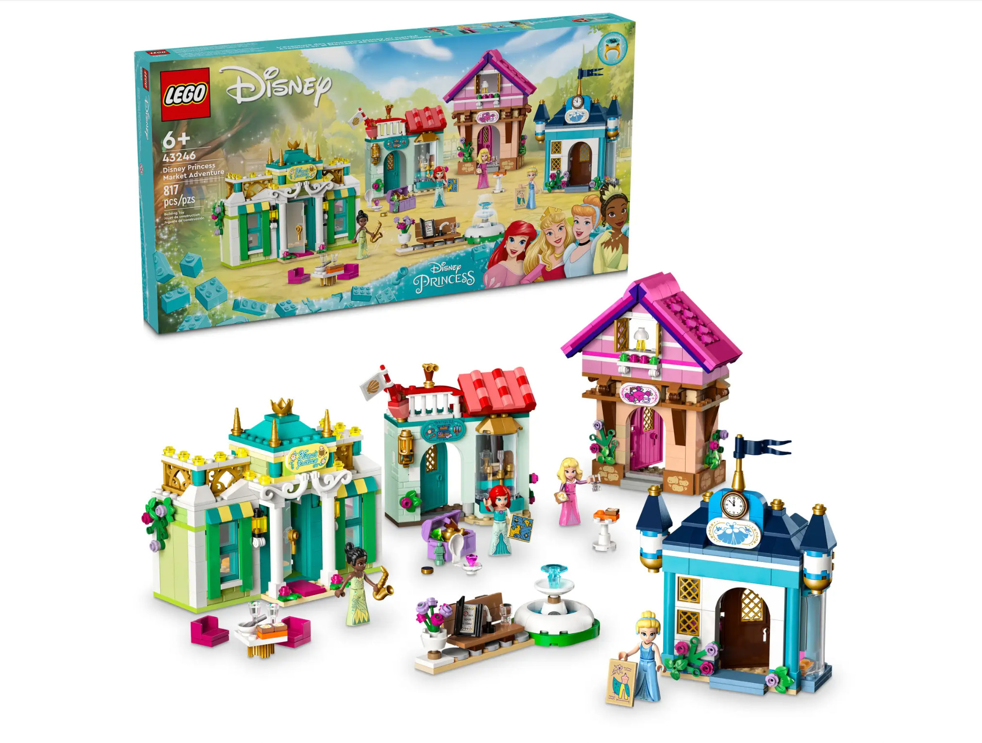 Affascina e intrattieni i bambini e i fan delle Principesse Disney dai 6 anni in su con questo dettagliato set di gioco costruibile Avventura al mercato Principesse Disney LEGO® ǀ Disney Princess (43246). La scatola contiene 4 edifici giocattolo costruibili, uno con un piccolo spazio di stoccaggio in cima e un piccolo modello con vaso di fiori, panca e fontana. Include anche le mini-doll LEGO ǀ Disney di Tiana, Aurora, Cenerentola e Ariel, più 2 anelli collezionabili con 4 decorazioni che possono essere cambiate più volte. I bambini possono progettare un’avventura al mercato, quindi inventare storie infinite o immaginare nuove avventure con tantissimi accessori per avviare il gioco.